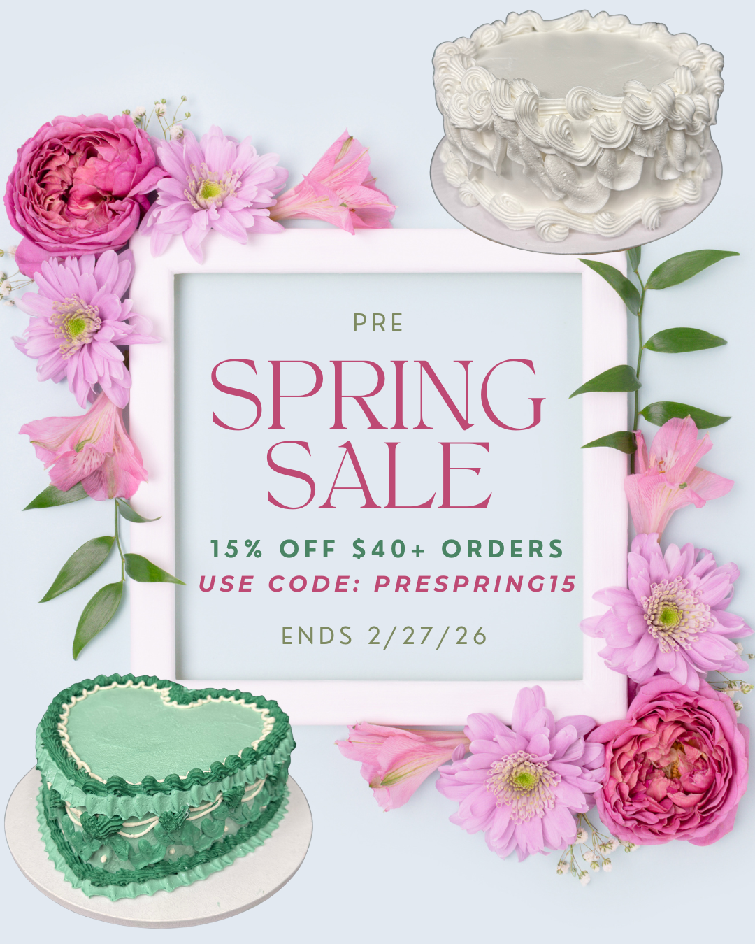 Pre Spring Sale: valid on NEW orders only placed thru 2/27/26. Applies to Signatrure, Specialty, and Vintage Cakes, and Cake Pies. Use coupon code: PRESPRING15